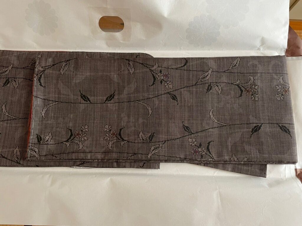 ↓こちらも泥染めの袋帯です。道長どりの模様があっさりしつつ動きもあって、着物の模様とかぶらないのでぴったりだと思います。