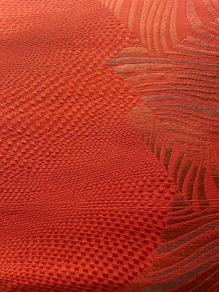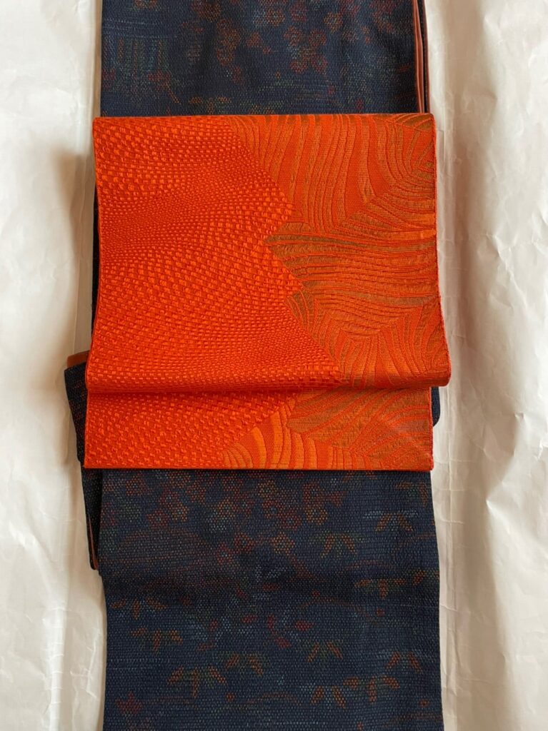 博多帯のような地風で、ぱっと見は強めのオレンジ色。